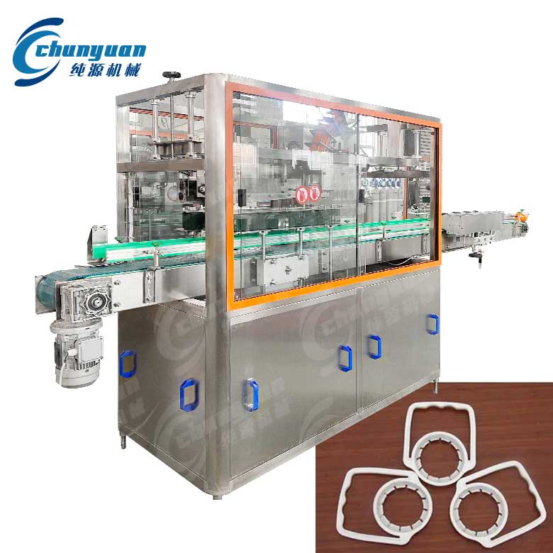 提手環(huán)停留在入口處,當(dāng)瓶子進(jìn)來后, 把提手環(huán)放在相應(yīng)位置保持不動(dòng),然后,夾瓶帶和輸送帶開始運(yùn)行,瓶口掛下提手環(huán)。首先通過鏈條或者旋轉(zhuǎn)壓輪,把提入環(huán)壓到既定位置深度的一半的地方,然后移動(dòng)鏈條末端或者通過旋轉(zhuǎn)壓輪,完成全部壓入動(dòng)作,壓入提手環(huán)程序結(jié)束。
